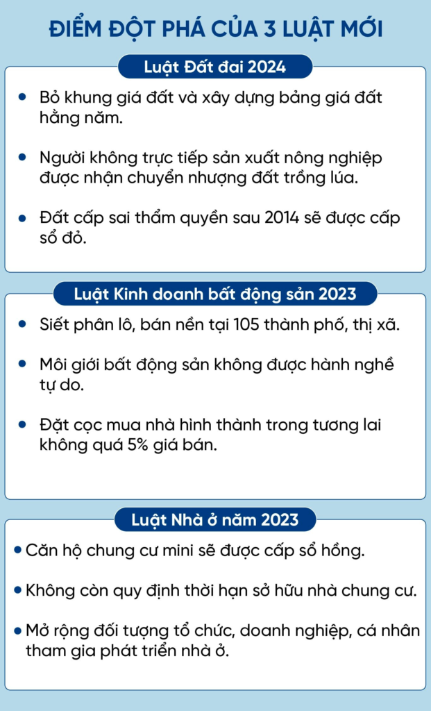 Bộ 3 luật bao gồm Luật Đất đai 2024, Luật Nhà ở 2023 và Luật Kinh doanh Bất động sản 2023 được Quốc hội cho phép có hiệu lực thi hành sớm hơn 5 tháng so với thời điểm quyết định trước đó là 1/1/2025 đã đánh dấu bước ngoặt quan trọng cho thị trường bất động sản, thúc đẩy sự phục hồi của thị trường sau 3 năm trầm lắng.